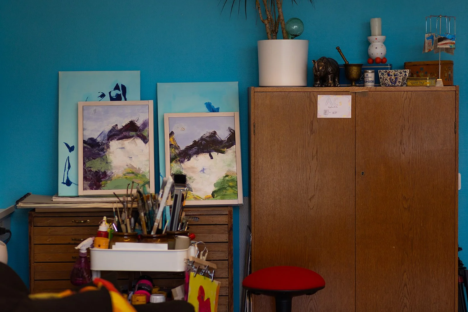 Det bästa är att jag skapat ett system där var sak har sin plats. Så jag vet var jag har mina papper, färger och penslar. Det är lätt att tiden går åt till att leta efter saker jag behöver. Särskilt nu när jag flyttar om i ateljén ofta. Den ska passa mig när jag jobbar och den ska passa för kurserna jag håller. Då gäller det att jag vet var jag ska lägga mina saker så jag hittar dem igen. Allt är inte perfekt än, men good enough i alla fall.